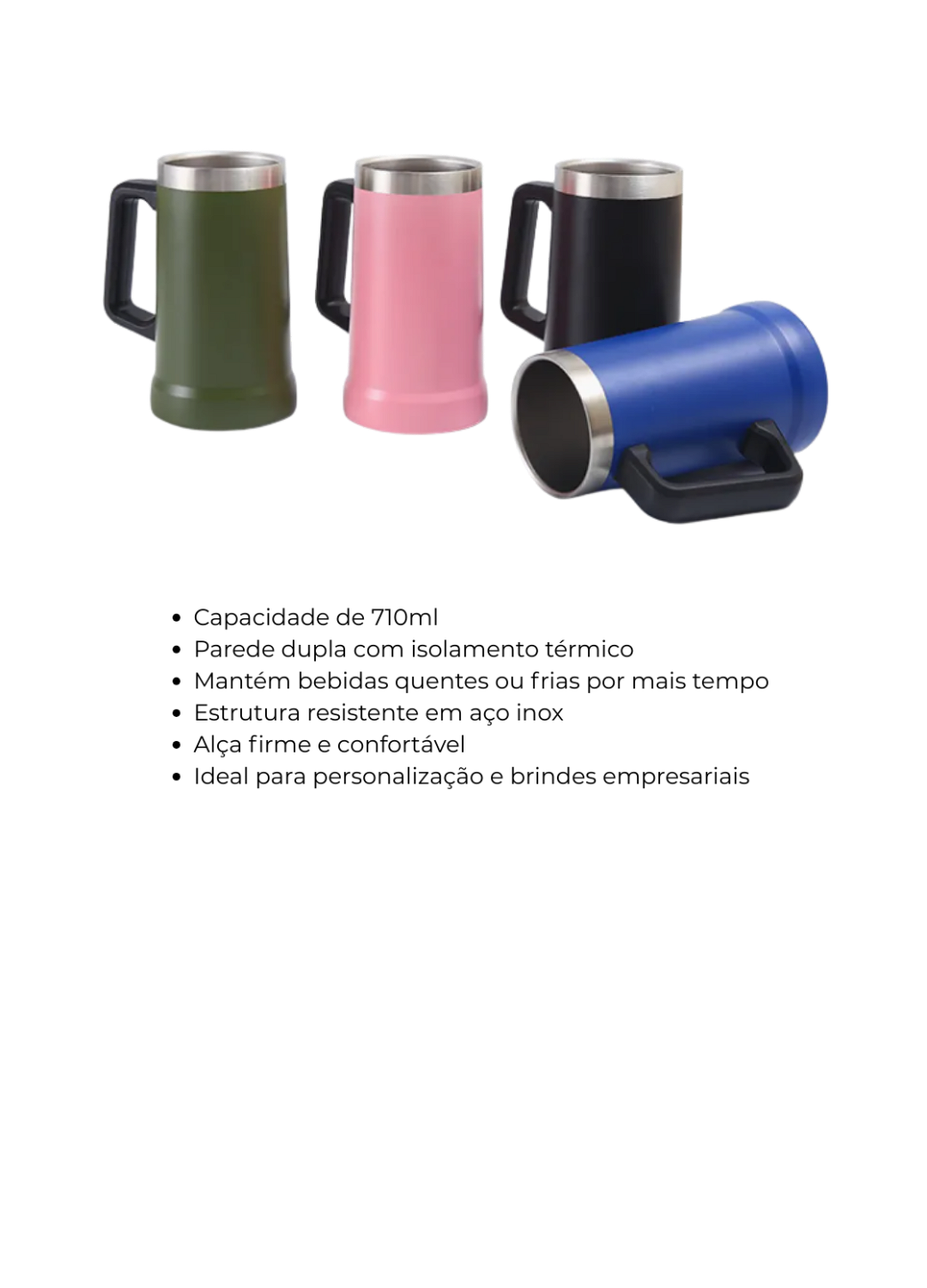 Com alça ergonômica que oferece conforto e segurança no manuseio, esse copo térmico combina perfeitamente funcionalidade e visual sofisticado. Disponível em cores variadas, é uma excelente opção para uso pessoal ou personalização com logo, sendo muito utilizado como brinde corporativo premium.