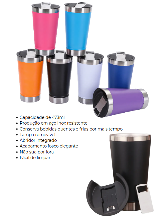 Acompanha tampa funcional que ajuda a manter a temperatura e abridor integrado, trazendo ainda mais praticidade para o dia a dia.