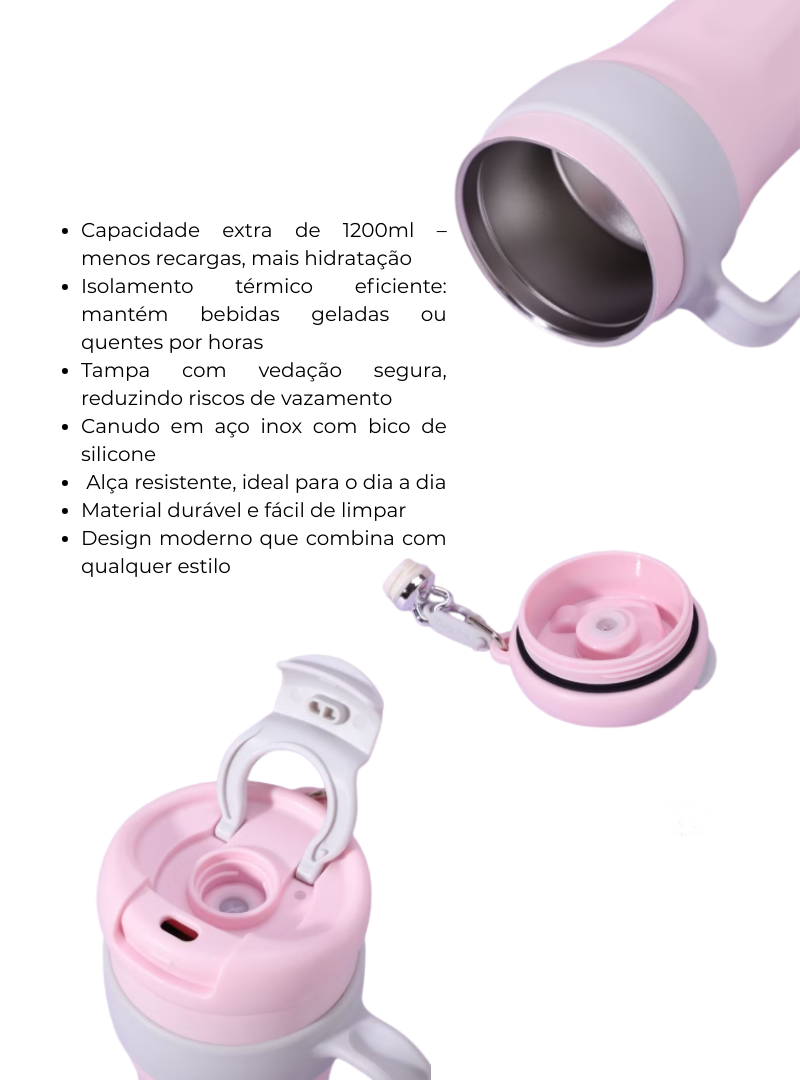 Com design moderno, cores suaves e alça ergonômica, ele foi pensado para facilitar o transporte e manter sua bebida na temperatura ideal por muito mais tempo.