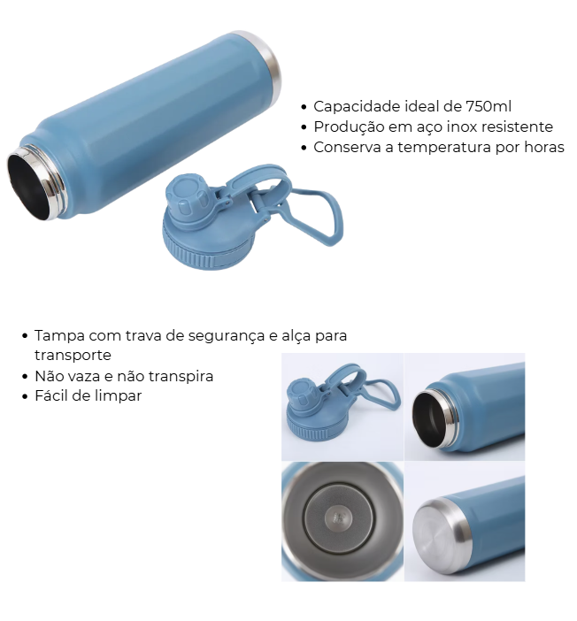 É a escolha ideal para quem busca hidratação ao longo do dia com praticidade e durabilidade. Produzida em aço inox de alta qualidade, ela mantém sua bebida na temperatura ideal por muito mais tempo, seja quente ou fria.